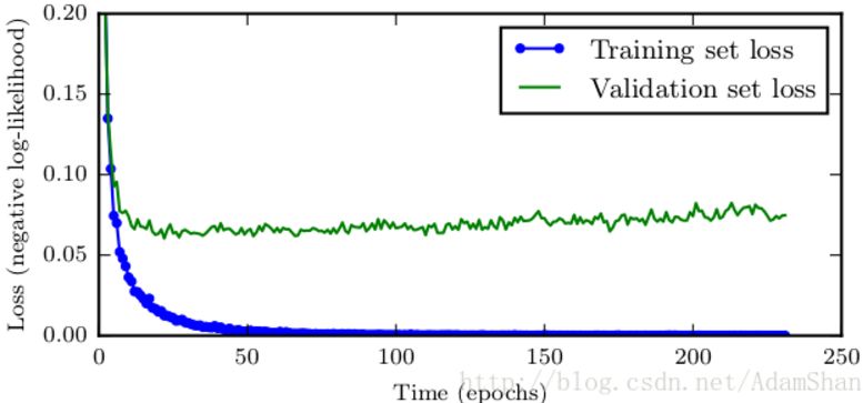 当训练参数数量大的神经网络时,即模型容量大于实际需求时,神经网络最终总是会过拟合,但是我们总是能够观察到,训练误差会随着训练时间的推移逐渐降低,但是验证集的误差却会先降低后升高,如下图所示: