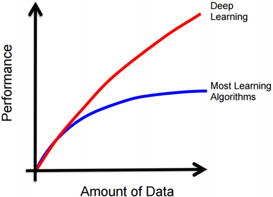其中的大量数据是深度神经网络能够在性能上取得成功的一个重要因素,传统机器学习算法在数据量增大到一定的数量级以后似乎会陷入一个性能的瓶颈(即使是基于结构风险最小化的支持向量机,其性能也会在数据量到达一定程度以后饱和),但是神经网路似乎是可以不断扩容的机器学习算法,数据量越大,可以通过增加神经元的个数以及隐含层的层数,训练更加强大的神经网络,其变化趋势大致如下: