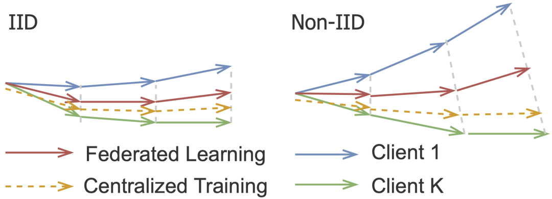 图 2 展示了用独立同分布和非独立同分布数据在联邦学习训练中产生的模型发散的现象