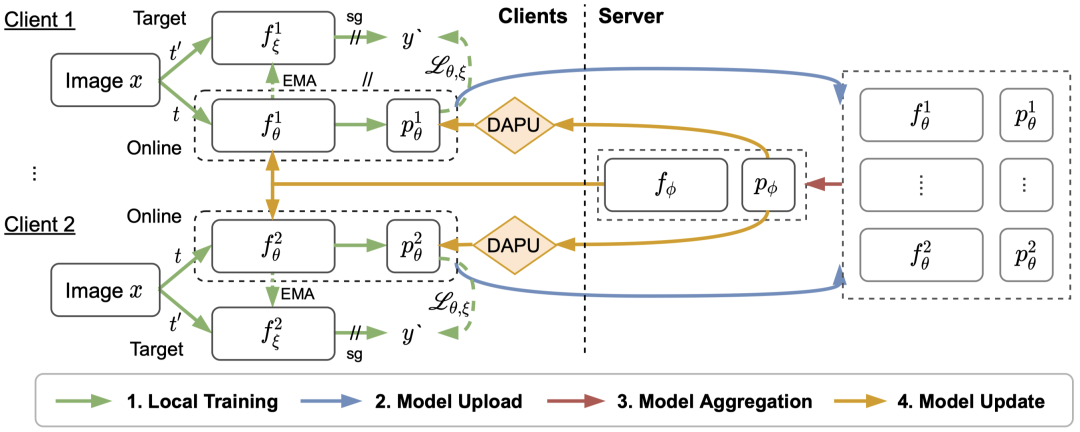 为了解决上述问题,我们提出了联邦无监督视觉表示学习框架 FedU。FedU 用一个云端服务器联合多个边端设备进行训练,在训练初始时,云端服务器初始化一个编码器 (Encoder) 和一个预测器 (Predictor),并发送给多个边端,初始化边端模型。再次之后,整个训练流程包括四个步骤(参考下图):