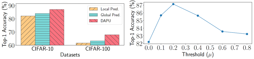 除此之外,FedU 还对比了使用不同的预测器的结果,使用发散感知的预测器更新策略(DAPU)在两个数据集上能得到最好的结果。另外,阈值