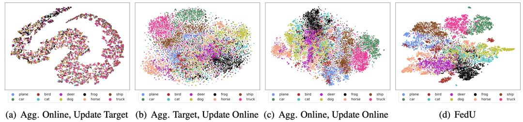 图 3 使用不同模型上传和更新学到的表示可视化对比