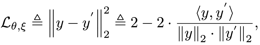 2. 将两个不同的变换分别通过在线网络和目标网络。在线网络中通过一个编码器和预测器,输出一个预测向量;目标网络通过一个编码器输出一个维度相同的向量,对比学习目标是让在线网络与目标网络的输出尽可能相近,所以对两个向量计算损失函数: