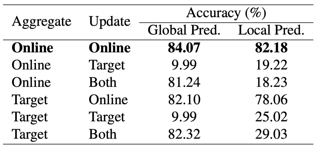 FedU 中提出应该上传并更新在线网络。首先从模型上传对于本地数据的视觉表示学习的有效性来看,在线网络的参数由于在每个训练的轮次都使用梯度下降进行更新,因此可以更好地捕获本地数据集的特征。其次,从模型更新的角度来看,在云端执行的模型融合是为了更好的泛化能力,而本地的目标网络只是提供本地数据集相关的监督信号,如果使用全局模型来更新本地的目标网络,则无法提供有效的本地数据集相关的监督信号供在线网络学习,降低了训练的效率。此外,如果同时更新本地的在线和目标网络则会导致本地模型需要去适应在异构数据上训练得到的全局模型,也会影响训练的结果。因此 FedU 中涉及的通信协议只上传并更新在线网络。
