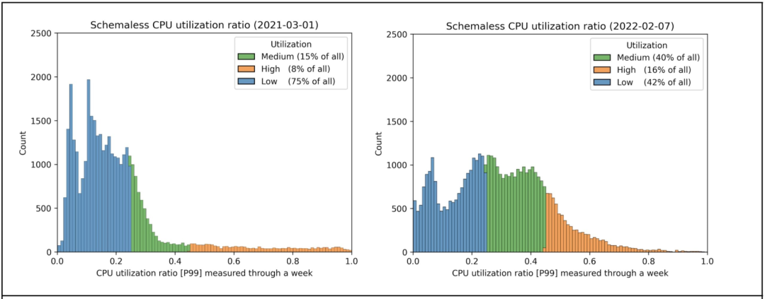 图 3:对大多数 Schemaless 实例应用 CPU 扩展前后的峰值 CPU 利用率直方图。低(Low)是指峰值使用率低于 25%,高(High)是指峰值利用率高于 45%。处于低类别从来都是不理想的,但有时是必要的。对于不受事件 / 故障转移影响的存储实例来说,处于高类别是有意义的。