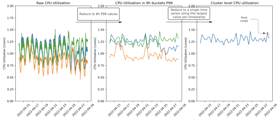 图 4:计算给定存储集群的峰值 CPU 利用率所涉及的步骤。默认情况下,总是回溯两周,以确保周末峰值在数据集中得到很好的体现。