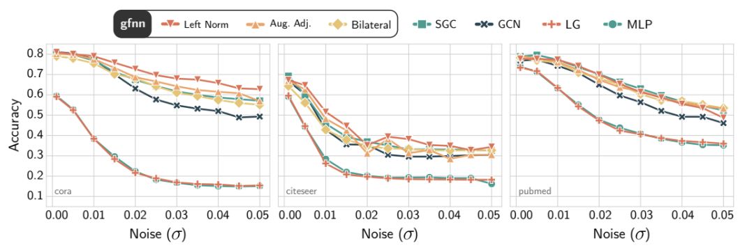 图4:Cora(左)、Citeseer(中)和Pubmed(右)数据集上的基准测试精度。噪声水平通过在特征值上增加白噪声的标准差来测量。