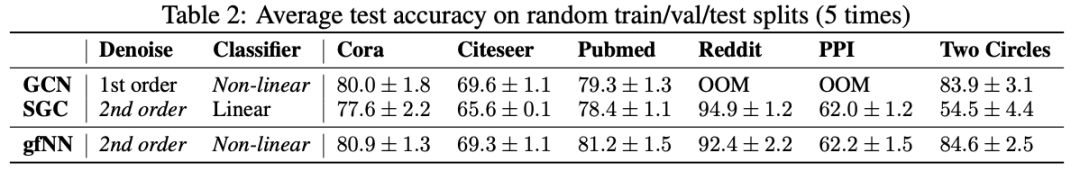 表2:随机train/val/test分段的平均测试精度(5次)