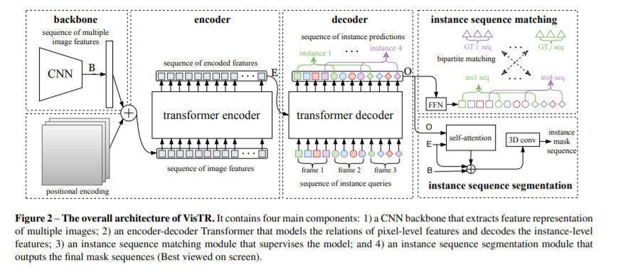 本文是第一个将Transformers应用于视频分割领域的方法。视频实例分割指的是同时对视频中感兴趣的物体进行分类,分割和跟踪的任务。现有的方法通常设计复杂的流程来解决此问题。本文提出了一种基于Transformers的视频实例分割新框架VisTR,该框架将视频实例分割任务视为直接端到端的并行序列解码和预测的问题。给定一个含有多帧图像的视频作为输入,VisTR直接按顺序输出视频中每个实例的掩码序列。该方法的核心是一种新的实例序列匹配和分割的策略,该策略在整个序列级别上对实例进行监督和分割。VisTR将实例分割和跟踪统一到了相似度学习的框架下,从而大大简化了流程。在没有任何trick的情况下,VisTR在所有使用单一模型的方法中获得了最佳效果,并且在YouTube-VIS数据集上实现了最快的速度。