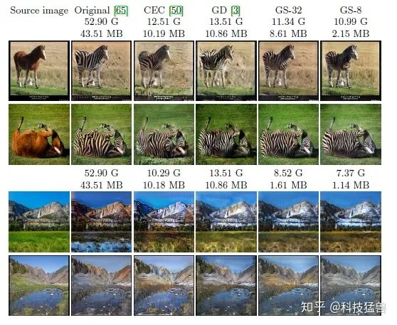 在winter-to-summer这个数据集上,GS-8可以压缩31倍之多。下图展示了一些可视化实验结果: