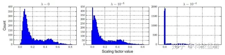 当超参数 越来越大时,scaling factor 之间的距离将越拉越大。有的channel将会变得越来越不重要,以极小化剪掉它们给模型带来的影响。