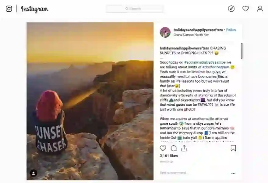 该张图片中Meenakshi坐在大峡谷的一块岩石边,配文为:我们很多人,包括你的真爱,都是敢于尝试站在悬崖与摩天大楼边缘的粉丝......,我们的生命真的只值一张照片吗?