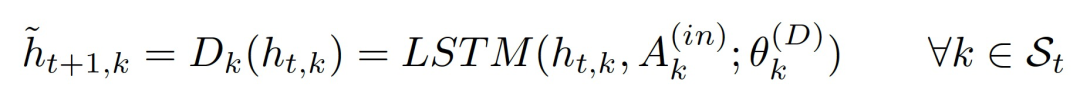 而对于激活的 RIM,运行一个独立的转换动态,将这些独立的转换动态记为 D_k,同时保证每个 RIM 都有自己的独立参数。以 LSTM 为例,激活的 RIM 响应于当前输入的注意力机制 A 的函数以下式更新:
