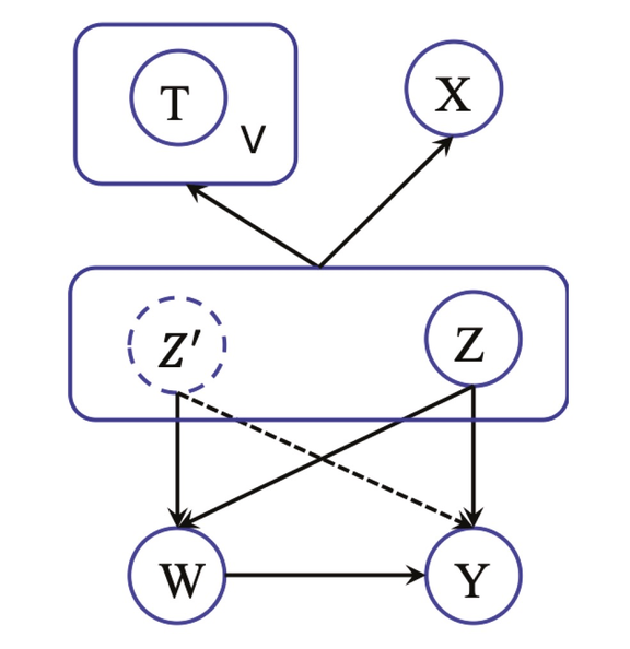 如图 3b 的 CGM 所示,与潜在变量相比,由于常见的延迟原因,由图形模型的内生变量编码的属性无法保证在统计上是独立的,但是仍然能够遵循独立性原则独立的干预数据。由图 3d 所示,其中分割节点表示在应用变换 T.^2 之前,在原始 CGM(3b)中计算 V2 的值。