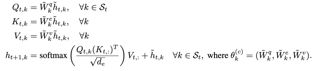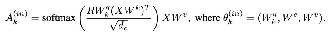 ⊕表示行级级联操作。定义线性转换构造键(K=XW.^k,每个输入元素一个,空元素一个)、值(V=XW.^v,每个元素一个)和查询(Q=RW_k.^q,每个 RIM 注意头一个),其中 R 是每行(r_i)与单个 RIM 的隐藏状态相对应的矩阵。W_v 是从一个从输入元素到相应的加权注意值向量的映射矩阵,W_k 为权重矩阵,它将输入映射到键。W_k.^q 是从 RIM 的每个隐藏状态映射到其查询的权重矩阵。此时注意力机制为: