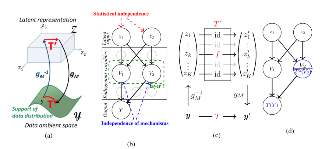 ,即促成生成过程的因果机制相互之间无影响。因此,可以通过单独修改某些生成机制来研究直接干预神经网络模型的效果。具体到生成模型中,因果关系允许分析如果某些变量采用不同的值(称为「反事实值」,counterfactual),结果会如何改变,进而评估生成模型捕获因果机制的能力。CGM 框架如图 3 所示,其中,(a)给出 生成映射和分离变换的图示,(b)为显示节点之间不同类型独立性的示例 CGM 的因果图,(c)为显示与分离变换 t 相关的潜在空间中的稀疏变换 t′的交换图,(d)为内在分离的图示。