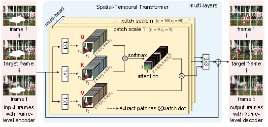 STTN 模型的输入是带有缺失内容的视频帧以及每一帧的掩码,输出则是对应的修复好的视频帧。如图6所示,STTN 模型的输入是带有缺失内容的视频帧以及每一帧的掩码,输出则是对应的修复好的视频帧。如图6所示,STTN 模型采用了 CNN-Transformer 的混合结构。其中,frame-level encoder 以及 frame-level decoder 采用了 CNN,分别将每个视频帧从像素编码成特征以及将特征解码成视频帧。Transformer 则作为模型的主干,它将输入的视频帧特征切成块,并对块的序列进行建模,再通过多层时空 Transformer 层挖掘输入帧中的已知信息来推断缺失内容。