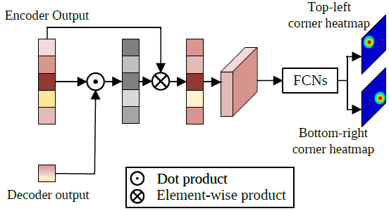 边界框预测模块的结构如图9所示,首先从编码器的输出序列中取出搜索区域相关的特征,用该特征序列与译码器输出的目标查询特征计算一次注意力机制,强化目标所在区域的特征,削弱非目标区域的特征。然后,经注意力机制强化后的搜索区域特征序列的空间结构被还原,并通过简单的全卷积网络预测目标左上角和右下角一对角点(corners)的热力图,最终的角点坐标则通过计算角点坐标的数学期望得到。不同于之前的Siamese和DCF方法,该框架将目标跟踪建模为一个直接的边界框预测问题,每一帧上都可直接预测一个边界框坐标,无需使用任何超参敏感的后处理。