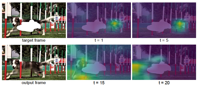 图7:Attention map 的可视化(attention 的部分用黄色高亮)。尽管视频里狗由于奔跑,在不同的帧里形态和位置差异较大,但为了填补目标帧(target frame)中狗身上缺失的部分,STTN 可以 “精准追踪” 到相关的帧里这只跑动的狗。