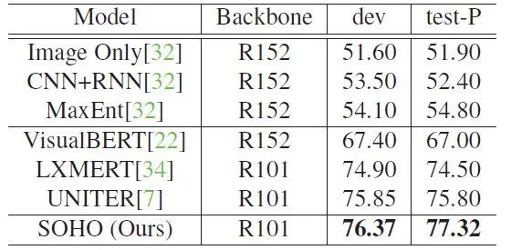 表格3:SOHO 在 NLVR2 数据集上的 Visual Reasoning 性能表现