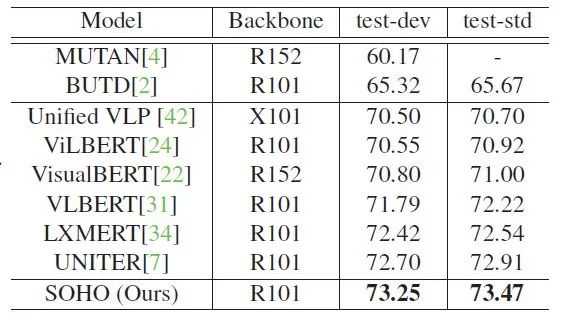 经验证,SOHO 模型不仅降低了对人工标注数据的需求,而且在下游多个视觉-语言任务(包括视觉问答、图片语言检索、自然语言图像推理等)的公平比较下,都取得了 SOTA 的成绩。