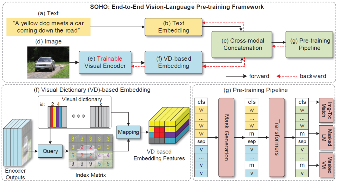SOHO 模型的主要思路是:将视觉编码器整合到 VL 的训练网络中,依靠 VL 预训练任务优化整个网络,从而简化训练流程,缓解依赖人工标注数据的问题,同时使得视觉编码器能够在 VL 预训练任务的指导下在线更新,提供更好的视觉表征。