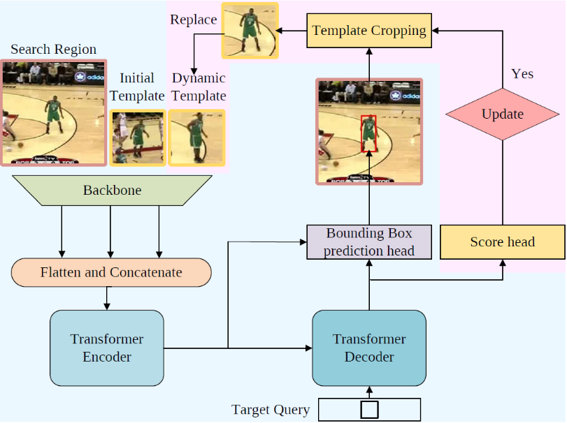 Spatio-Temporal 版本的框架图如图10所示,粉色区域展示了为了利用时序信息而新加入的结构。新框架额外加入了一个 “动态模板” 作为新输入。动态模板是根据中间帧跟踪结果裁剪得到的,并随着跟踪的进行动态更新,为整个框架补充了之前缺少的时序信息。利用第一帧模板、当前帧搜索区域、动态模板同时作为 Transformer 编码器的输入,编码器能够从全局视角提取时空信息,学习到鲁棒的时空联合表示。除动态模板之外,研究员们还引入了由多层感知机实现的更新控制器来更新动态模板,它与边界框预测头并联,以预测当前帧可靠程度的置信度分数。