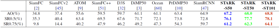 STARK 在多个短时跟踪与长时跟踪数据集上都取得了目前最先进的性能,并且运行速度可达 30FPS 到 40FPS。其中,在 LaSOT, GOT-10K, TrackingNet 三个大规模目标跟踪数据集上的结果如下所示。