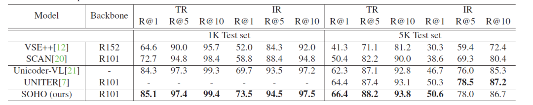 表格1:SOHO 在 MSCOCO 数据集上与其他方法的 text retrieval(TR)和 image retrieval(IR)的性能比较