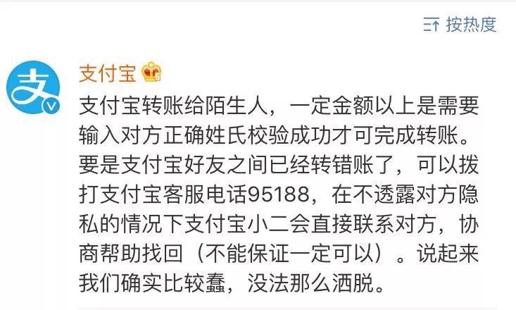 随后,支付宝转发评论补充:支付宝转账给陌生人,一定金额以上是需要输入对方正确姓氏校验成功才可完成转账。要是支付宝好友之间已经转错账了,可以拨打支付宝客服电话95188,在不透露对方隐私的情况下支付宝小二会直接联系对方,协商帮助找回(不能保证一定可以)。说起来我们确实比较蠢,没法那么洒脱。