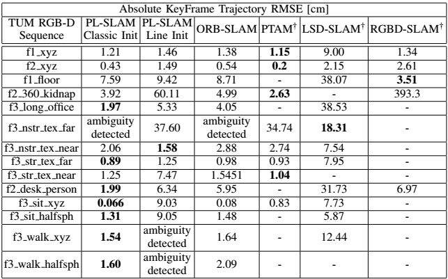 如表1所示,在基于TUM RGB-D数据集的实验中,由于小旋转运动的假设,线段地图的初始化失效了,但是在弱纹理序列f3 nstr tex far中,我们的方法能够得到初始化地图,优于其他方法。