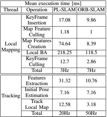 如表2所示,PL-SLAM算法通过引入线特征提升了ORB-SLAM算法的精度,但是也增大了计算复杂度。可以看到,map features creation和local BA花费了最多的时间。但是不管怎样,PL-SLAM算法最终的帧速率接近一般PC的实时帧速率,即20fps。