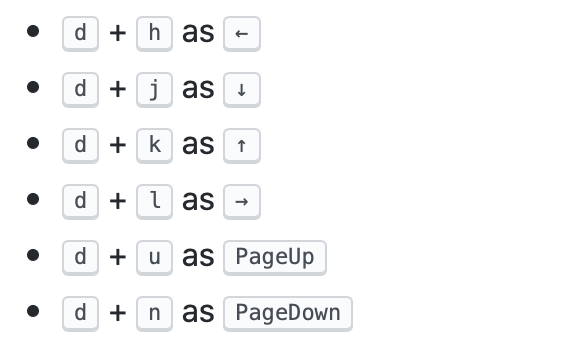此时 H、J、K、L 键分别被映射为上下左右方向键,而 U 与 N 则被映射为 PgUp 和 PgDn。