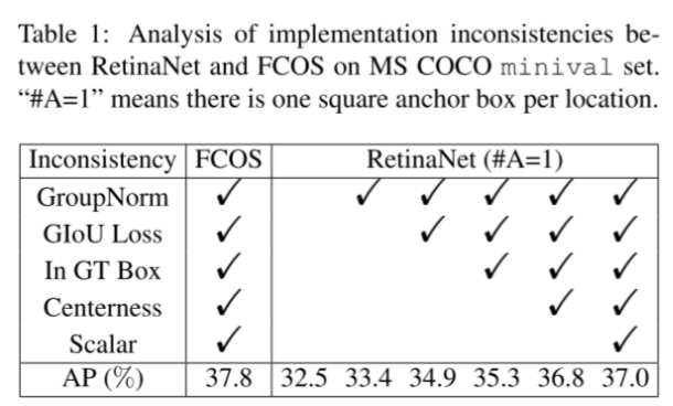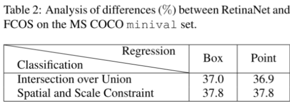 FCOS相比于只设置一个anchor先验的RetinaNet来说,COCO数据集上的mAP高差不多5个点,为了公平的比较RetinaNet和FCOS的精度差异的原因,ATSS的paper中用一致的trick对RetinaNet和FCOS进行实验。如实验所示,相同trick设置下,RetinaNet比FCOS少0.8个点,这时RetinaNet和FCOS的差别仅仅在于采样方式和回归起点的不同。
