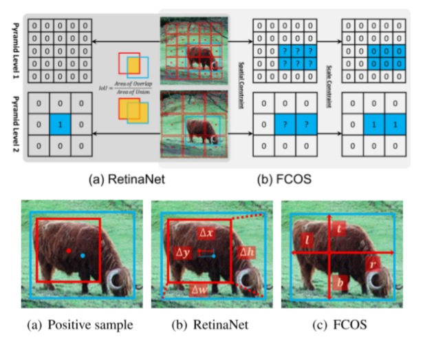 2.正负样本的采样方式不同。RetinaNet通过IOU来选择正负样本,而FCOS通过空间和尺度的约束来选择正负样本。
