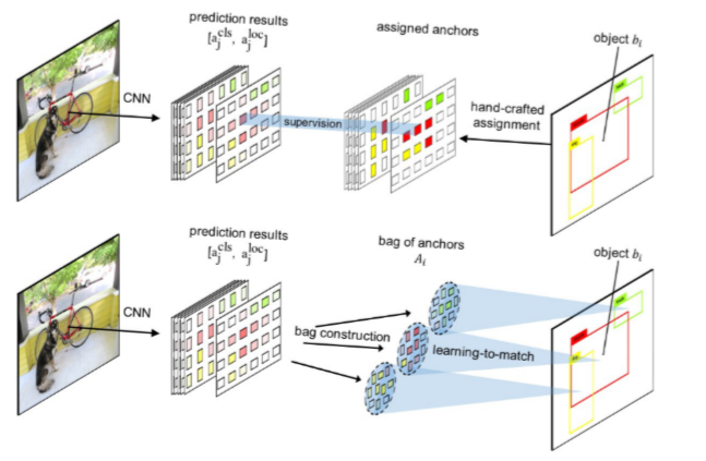 FreeAnchor在RetianNet的基础上,将检测器的训练过程定义成一个极大似然估计问题,通过优化recall和precision似然函数的loss,自适应的将匹配的anchor构建成bag of anchors。