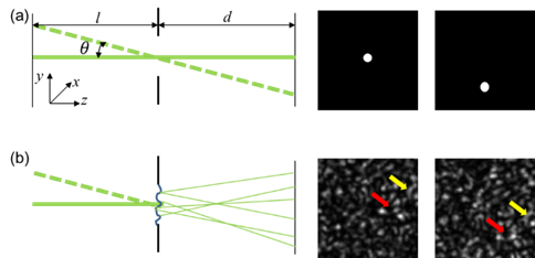 如果圆孔内有大量随机分布的散射颗粒,由于折射率的随机涨落,这时我们在屏上看到的是一幅散斑图。入射激光偏转时,散斑图案相对不变,只是整体位置发生了平移,这种现象就是光学记忆效应。即经过散射后,光子仍然保留对初始入射方向的记忆。