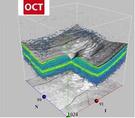 利用相干门(满足特定条件能形成稳定的干涉花样)选择未被散射的光(这一部分光的能量随着介质厚度的增加指数衰减),可以看清大约1mm厚的生物组织,被广泛应用于眼底病变的筛查诊断。