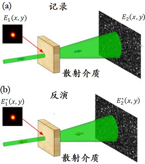 由于光路具有可逆性,探测散射波前并生成共轭波前,共轭反向传播补偿散射的影响,特定条件下等效透明散射介质进行成像。