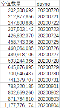 在对 guid 这个 key 进行初步统计后,发现为空值的数量竟然有数亿行,并不断增长: