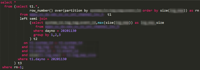 在一般情况下,上述 SQL 能较好的运行。但我们这次情况出了点意外:经过上述操作后,我们得到的数据还有 800 多亿行。因为 max(size(xxxx) = size(xxxx) 的数据占了绝大多数,导致我们匹配回去无法有效的筛选出少量结果。我们必须找到一个能有效区分各行数据的字段,这个字段的值必须很松散。最后我发现比较好的是 userid。因此将 max(size(xxxx)) 替换成了 max(userid),任务很快就跑完了。因为不影响我们讲述优化的原理,所以不再描述这部分细节。