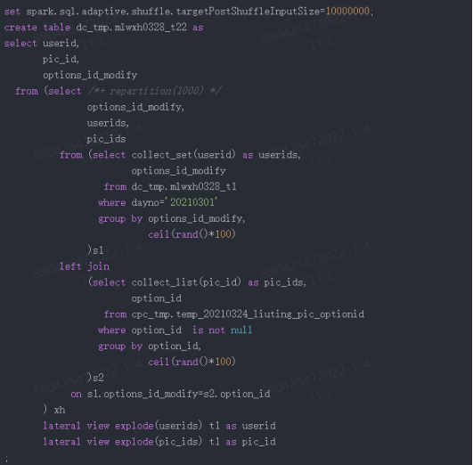 代码里的 hint(repartition(1000))的作用是考虑到经过 collect_list 聚合后的数据单行携带的数据经过一行变多行的展开操作后会膨胀很多倍,因此单个任务处理的数据量必须很小,才能保证处理速度够快。这个 hint 的作用是告诉系统将上一阶段关联后的结果分成 1000 份,交给下游处理;