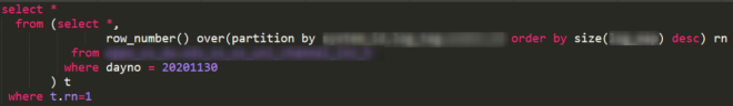 稍微解释一下 SQL 的意思:希望取出上报数据里针对某个维度组合的一条内容较为丰富的样本数据,因此以某字段的 size 作为降序排序并取结果的第一条。