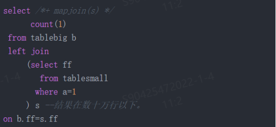 要让执行计划改成广播 s 子查询结果,加 hint mapjoin (也可以是 broadcast)就可以了。