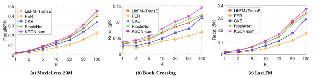 我们在三个真实的推荐系统数据集(MovieLens-20M,Book-Crossing,Last.FM)上进行了实验,结果表明我们的方法取得了优秀的性能表现。例如在点击率预测中,KGCN实现了在三个数据集上的平均4.4%,8.1%和6.2%的提升,在top-k推荐中,KGCN的召回率曲线也均高于对比方法。