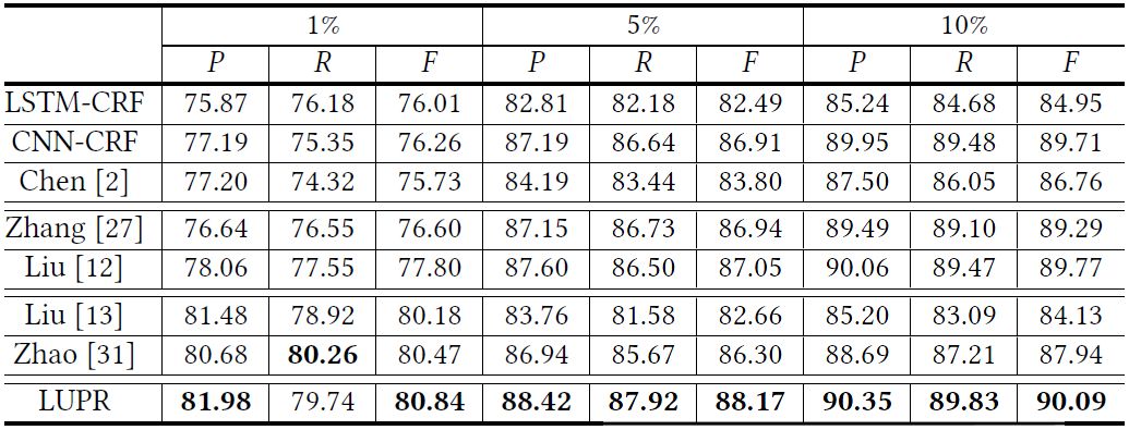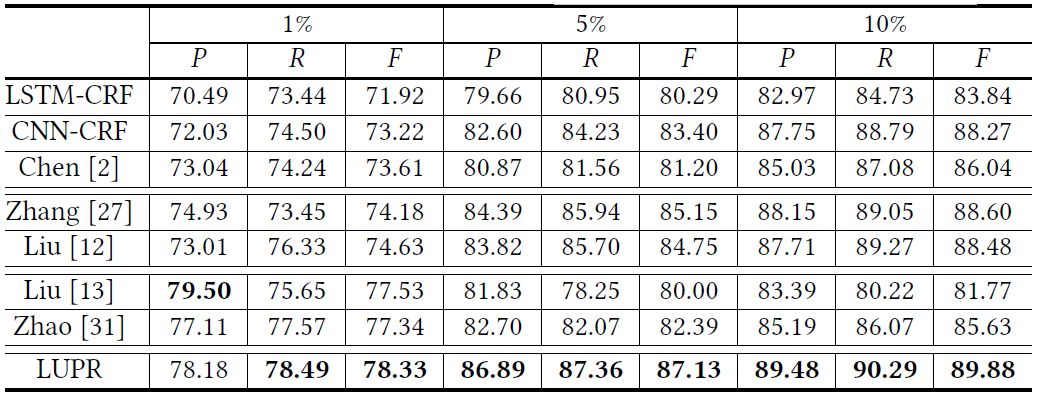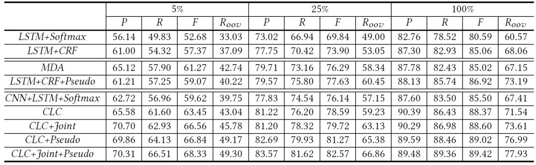 本论文在第三届和第四届SIGHAN中文处理竞赛的命名实体识别数据集上进行了实验。如下表所示,CNN-LSTM-CRF模型在中文命名实体识别任务上的性能要显著优于目前流行的LSTM-CRF模型。同时,结合汉语分词的联合框架可以有效提升中文命名实体识别的效果。此外,本论文提出的伪标注数据构造方法可以显著提升不同中文命名实体识别模型的性能,尤其是在未登录实体(OOV)上的表现,证明这些自动构造的伪标注数据有效提升了模型的泛化能力。