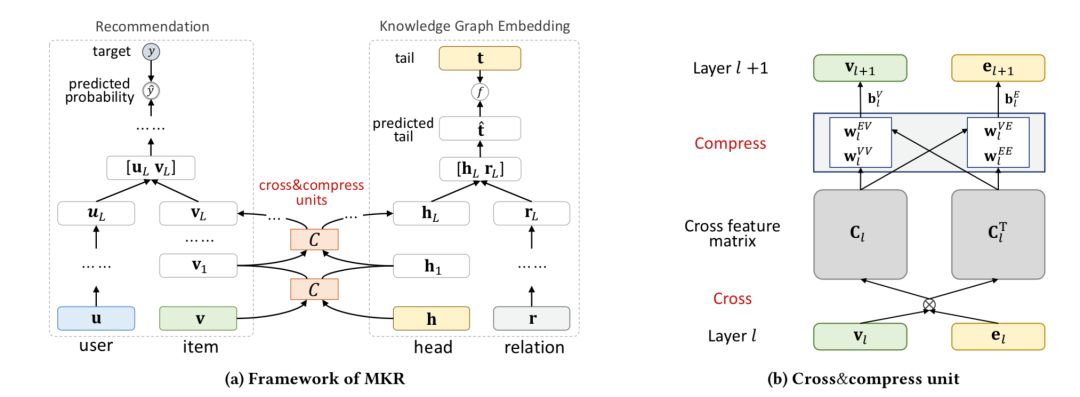 在该论文中,我们将推荐系统和知识图谱建模视为两个分离但是相关的任务,设计了一个多任务学习的框架,利用知识图谱建模任务来辅助推荐系统任务(下图a)。这两个任务之所以相关,是因为推荐系统中的一个物品会和一个或多个知识图谱中的实体相对应,因此,它们在各自的向量空间中的表征应该有相关性。为了表达这种相关性,我们在提出的模型中设计了一个“交叉-压缩”单元,这个单元显式地对物品表征和实体表征的高阶交互进行建模,并自动控制两个任务之间的知识的交叉迁移。
