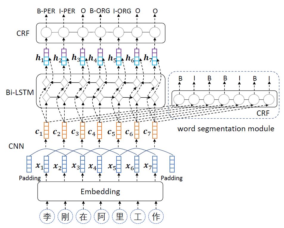 为了解决这些问题,本论文提出了一种结合汉语分词的中文命名实体识别框架(如下图所示),通过联合训练中文命名实体识别模型和汉语分词模型来提升中文命名实体识别模型对中文实体边界的识别能力。同时,本论文提出了一种CNN-LSTM-CRF的中文命名实体识别模型,用来更好地对中文句子的局部和全局上下文信息进行建模。此外,本论文提出了一种基于同类实体替换的自动标注数据构造方法,能够从已有的少量标注数据中构造更多的伪标注样本,显著提升模型的泛化能力。