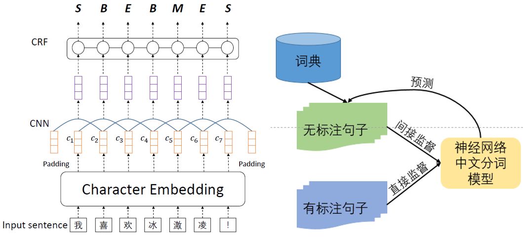 由于存在很多大规模、高质量的汉语词典,并且无标注的汉语句子相对容易获取,本论文提出了一种能充分利用汉语词典和无标注数据的中文分词方法,以降低对标注数据的依赖,提升分词效果。我们提出了一个基于后验正则 (posterior regularization) 算法的框架,能够将中文词典和无标注数据生成间接监督信息并用于模型训练,从而约束中文分词模型的预测空间。我们使用CNN-CRF模型作为基础的神经网络分词模型(如左下图所示),同时利用词典和无标注数据产生的间接监督信息和有标注数据中包含的直接监督信息来训练神经网络分词模型,并通过多次迭代来逐步优化模型的效果。