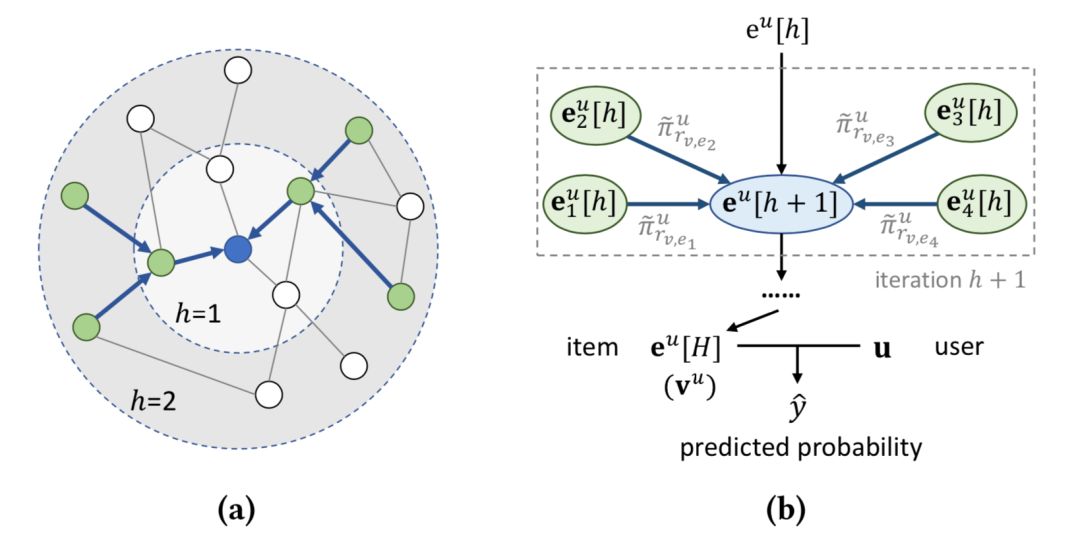 由于知识图谱是异构图,而GCN只能对普通的同构图进行建模,因此我们需要将知识图谱进行转化。为此,我们提出使用一个“用户-关系评分函数”,在给定一个用户的情况下,将知识图谱中边(即关系)的种类转化成了权值信息。对于转化后的知识图谱,我们首先对每个节点的多跳邻居进行采样(见下图a),得到了固定大小的邻居集合。然后,我们逐层将邻居节点的表征进行加权聚合,并当作该节点在下一轮中的表征(见下图b)。这里的加权系数即为我们在上一步中得到的边的权值信息。经过k层聚合之后,一个节点的最终表征就融合了其最多k跳的邻居节点的信息,这有助于在知识图谱中探索和扩展用户的兴趣。